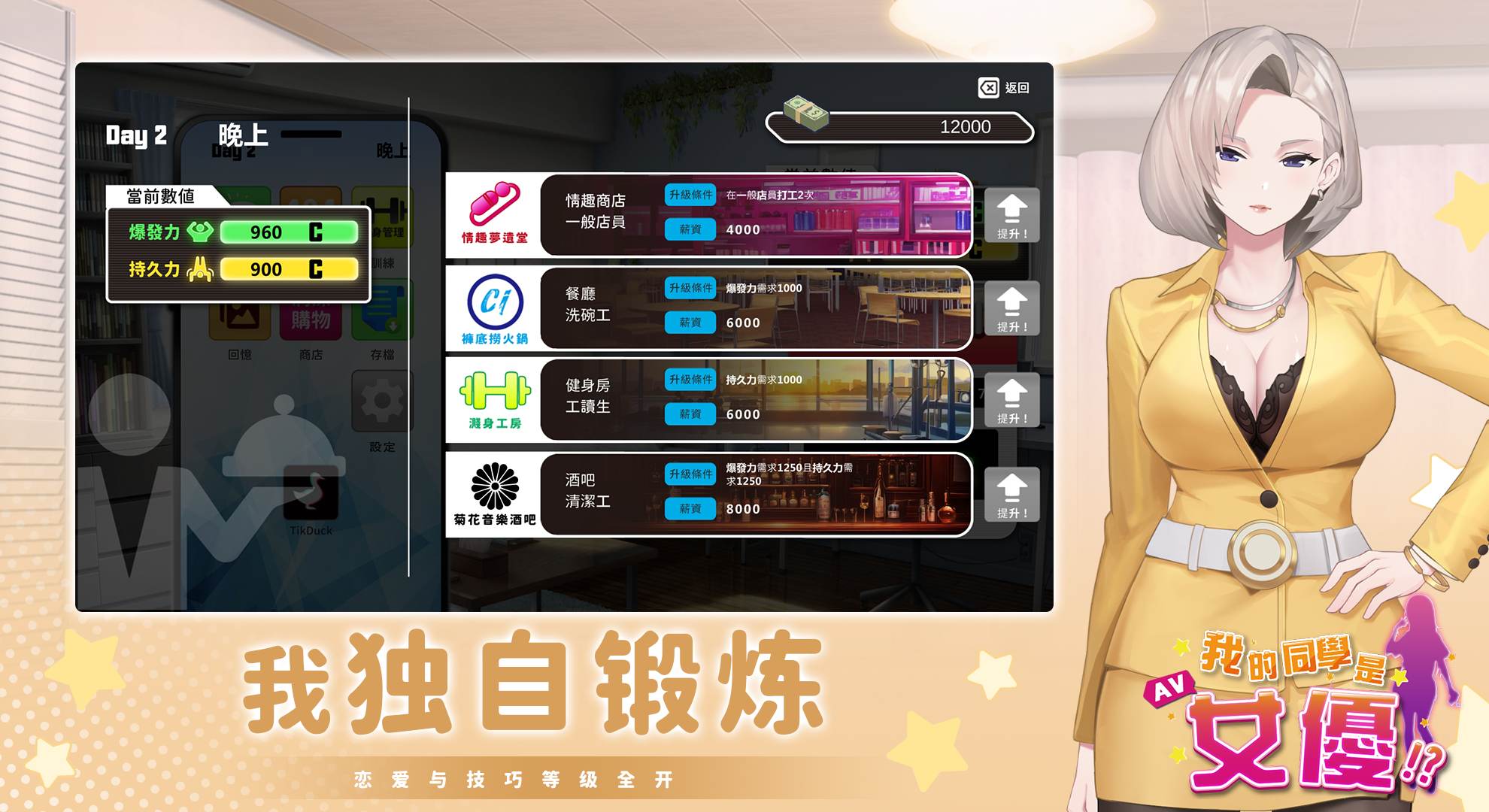 每个时段可以进行[打工]、[训练],提升自己的持久力、爆发力,来获得异性青睐,让她们愿意与你约炮,并在主线与各种事件中,逐步拉近与角色们的关係吧!