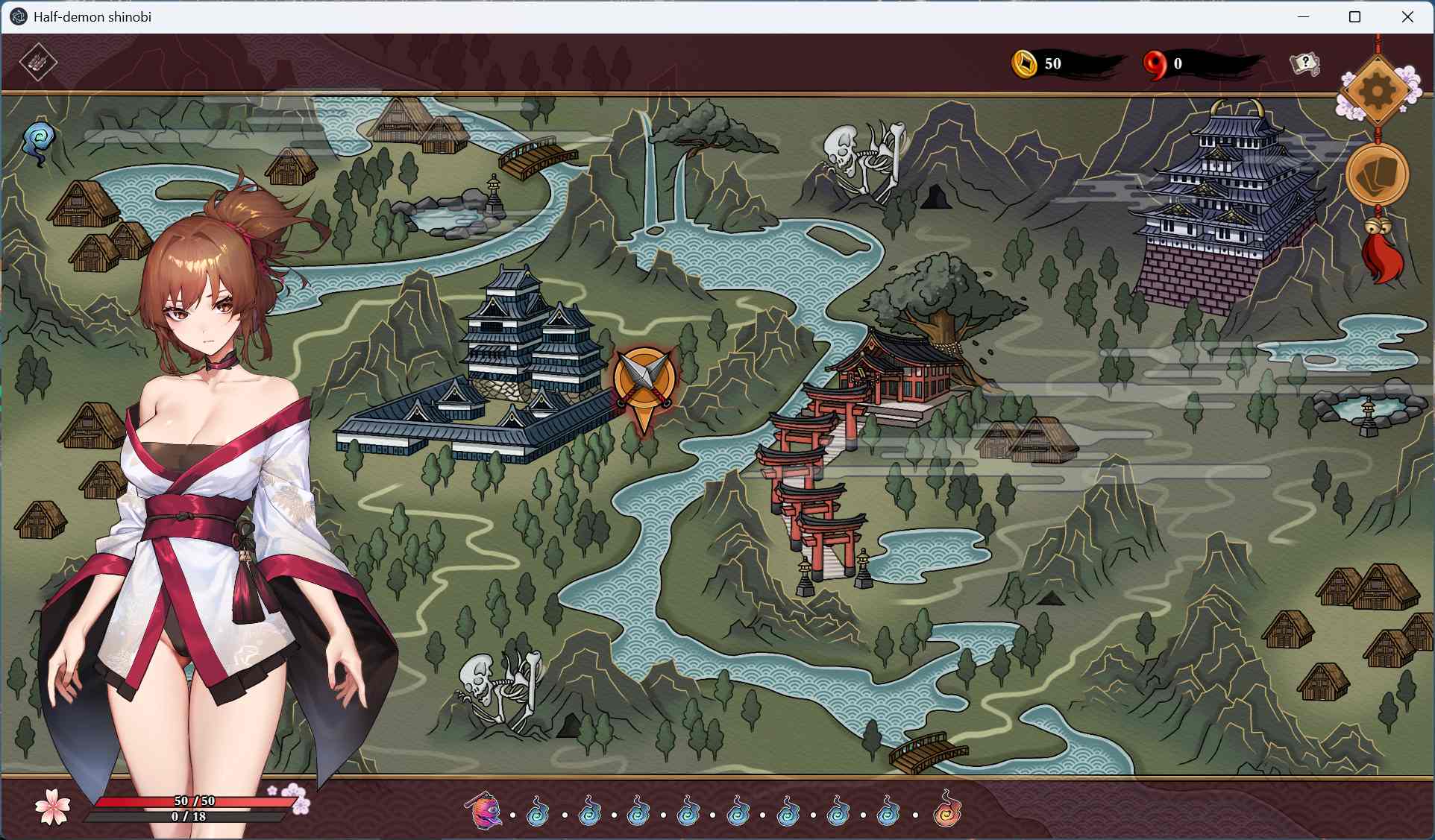 在和风的地图场景探索,将随机生成包含战斗、休憩、宝箱、商店、等各种事件。
