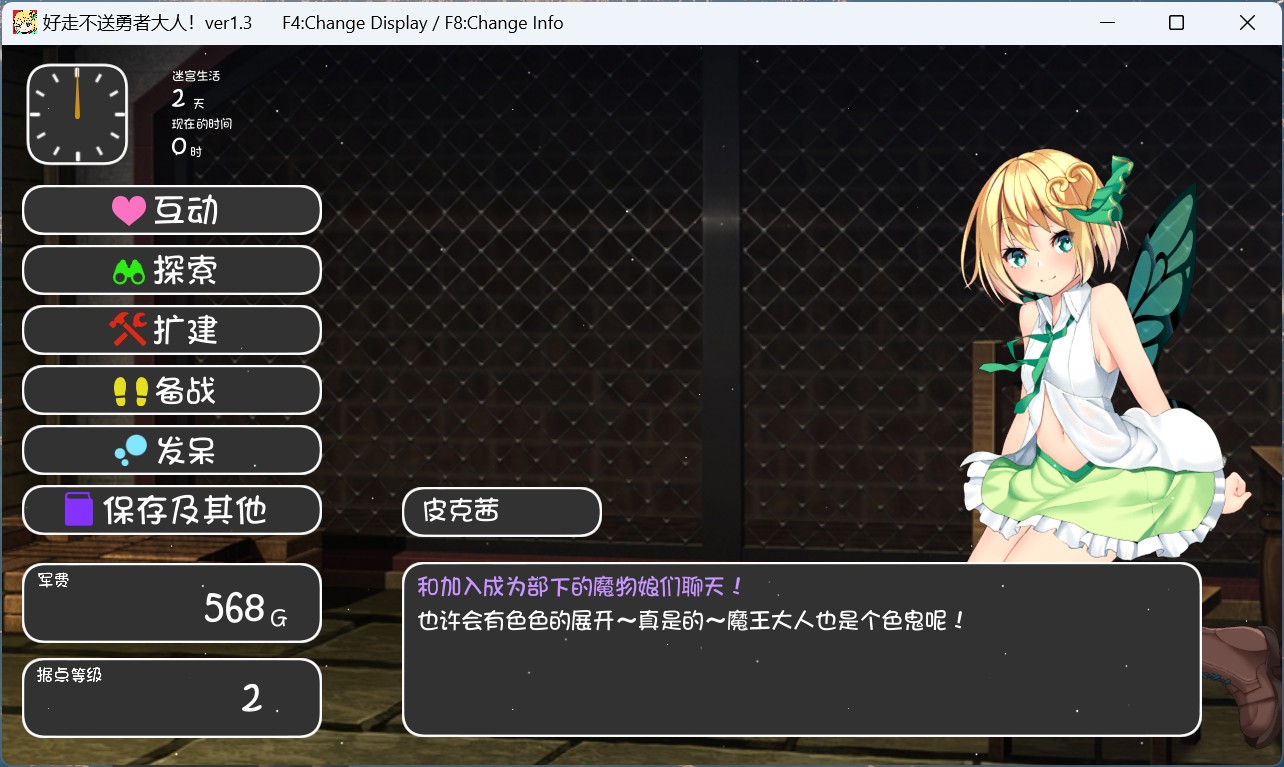 游戏设定玩家被一个小精灵指定为新魔王,需要在每7天一次的时间内,抵御周围勇者组成的联军讨伐队。你的手下是一群杂鱼+天仙般样貌的魔物娘。白天抵御入侵,晚上潜入村庄偷盗物资来补充资源或者强化战力。