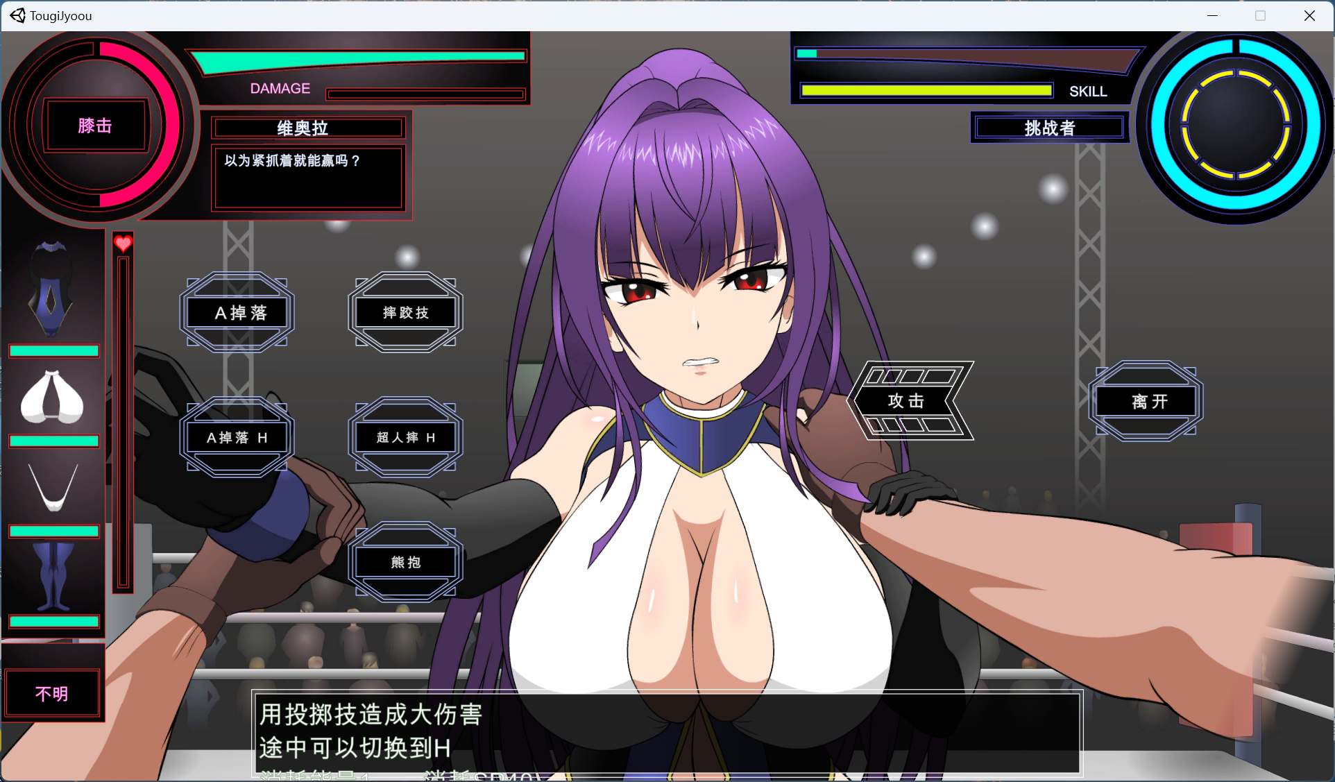・玩家一方的技能包括“使其跌倒”、“使其昏厥”、“挑衅诱使反击”等,支持多种亲密互动。