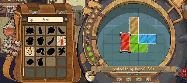 在你的坩埚里煮药。 你可以将收集到的原料放入坩埚,从而调配药品和维生素等等。随着经验的积累,你将能够调制更高级的配方——需要的原料更多,但效果也更好。强化后的坩埚可以调制更多配方原料,从而获得更高级的药品。