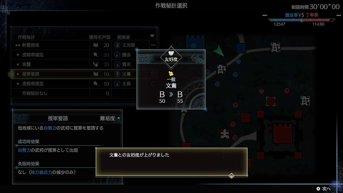 「友好度」除了透過新要素「散步」可以提升之外,也可以透過共赴戰場,或是採用武將所提案的「作戰秘計」等方式來提升。