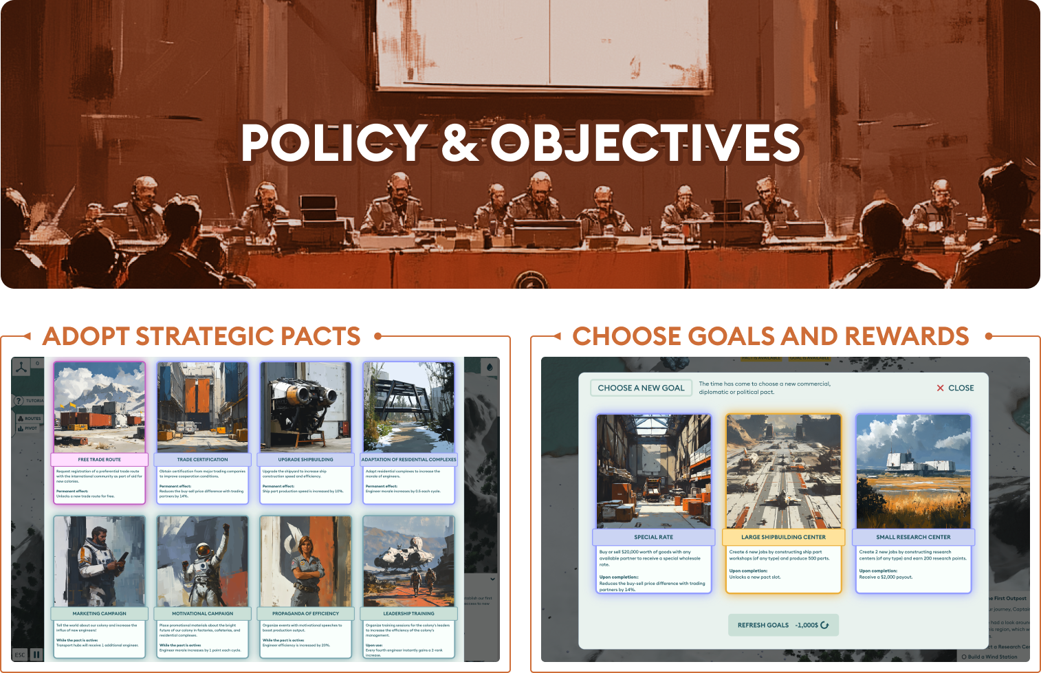 采用协议和目标来暂时或永久地改善你的殖民地。谨慎选择,因为这些重大决定只能偶尔做出。