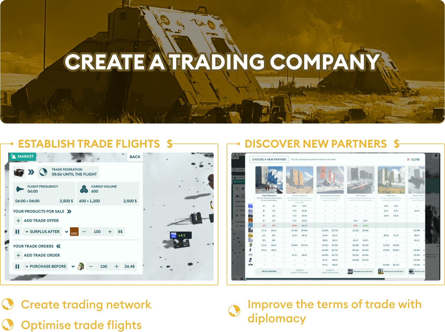 自动化与其他殖民地和贸易网络的交易,找到最有利可图的路线,并在市场上进行投机。通过外交目标和协议解锁新机会。
