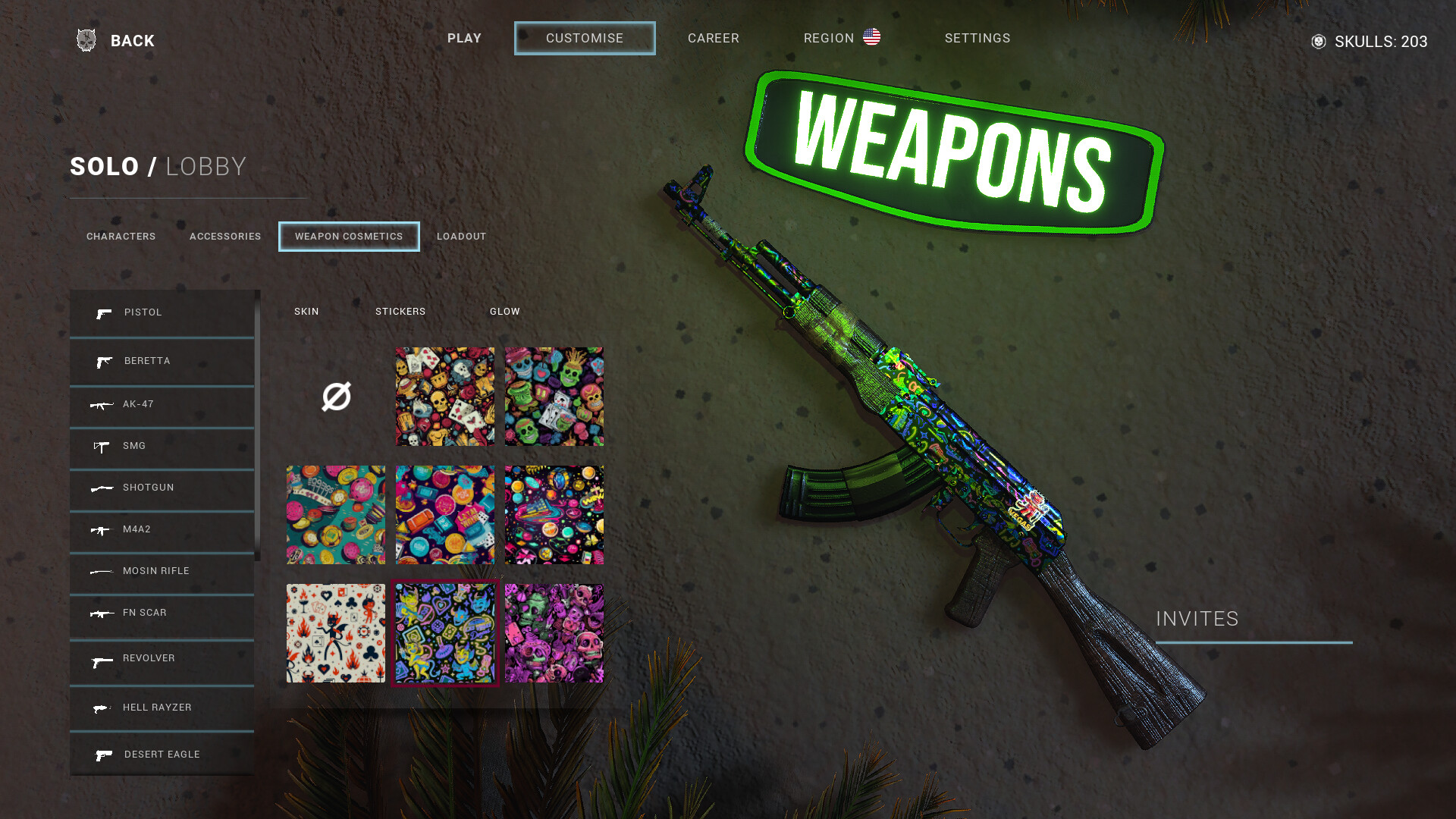 在拉斯维加斯发生的一切,就留在拉斯维加斯,所以不妨玩一玩老虎机!在“Win A Weapon”机器上摇出各种各样的武器,或者在“Spin A Boost”上试试你的道具运气。还没赢够?“Bag A Prize”或者“Rand A Bang”也值得一试。只想解锁那些炫酷的外观?那就玩玩我们的“Pull A Skull”机器,提升游戏结束时派发的奖励。