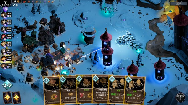 在每处敌方据点前,您需要用收集到的卡牌建造城镇,时间宝贵——每经过一回合就意味着失去一日的时间。虽然城镇的初期规模较小,但短时间内您就能打造出一座生产各类资源的工业城市。