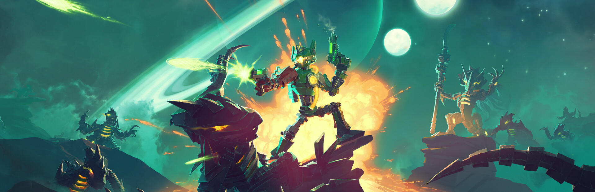 身为太空炮手,将敌方机器人炸入无尽深渊!我们貌不惊人的英雄们需要磨练技艺并收集各种武器,以击溃类型多样的机器人大军。无论是面对邪恶软件的深渊海军还是其他敌人,利用不同的武器在实时地面与太空战中优化你的战斗手段。