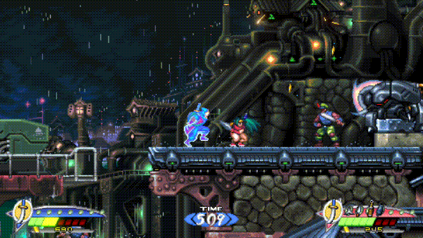 本作在实现16Bit复古画面风格的同时,借助了新技术来呈现画面的精致感和丰富度。两位忍者主角飒(Hayate)与枫(Kaede)不仅以全新造型亮相,所有关卡场景及敌人也都进行了重新绘制。相信这些经过精心刻画后的人物和场景,将带给大家眼前一亮的视觉感受。
