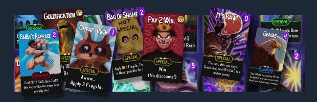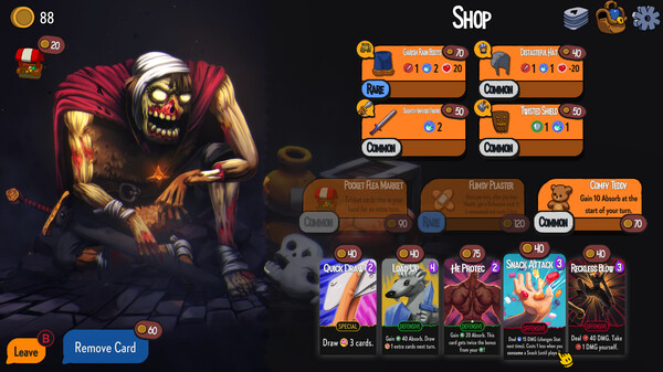 - 构建你的卡组,从100多张卡中掌握荒诞的协同效果:把敌人变成金币,利用他们脆弱的自尊心,同时躲在你的召唤物后面,向敌人扔食物等等!